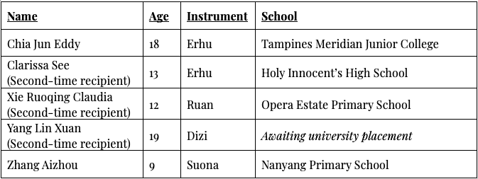 Recipients from earlier cohorts have continued to make significant strides, earning recognition on national platforms such as the Singapore Chinese Music Competition. At the 2024 edition, scholarship recipients Li Zhixin, Claudia Xie, Preston Ang, and Ee Anzhi received awards in their respective categories, reflecting both their growth and dedication. Beyond competitions, scholars have also gained valuable performance experience on prominent stages with Ee Anzhi performing at the National Day Parade in 2025, and Li Zhixin, Clarissa See, and Ee Anzhi taking the stage at the Istana Open House in 2026. These milestones have contributed to their artistic maturity and personal confidence.